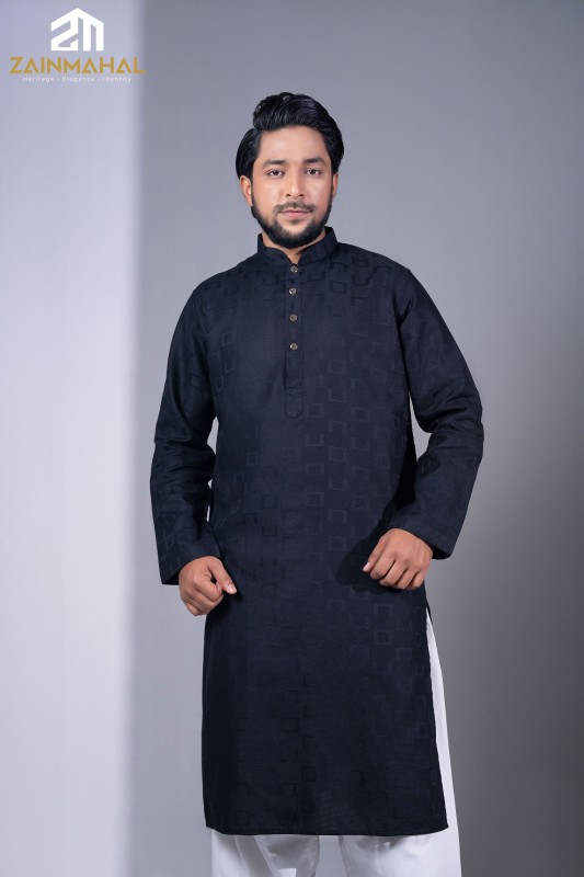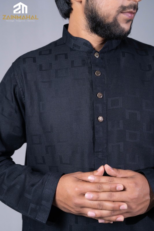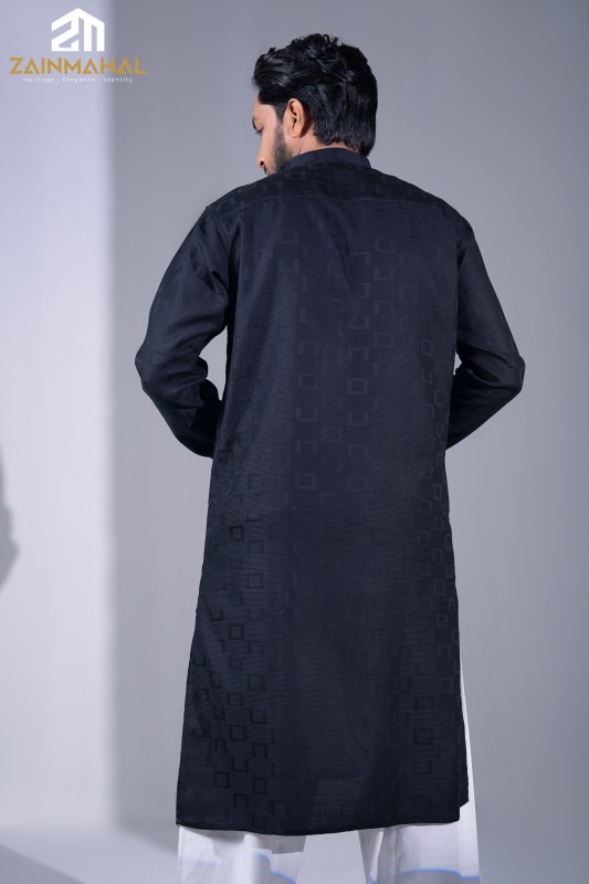 Effortless style meets superior comfort in this premium Indian Cotton Panjabi. The subtle geometric texture adds a modern edge to the classic black silhouette, ensuring you stay cool, sharp, and confident all day long.