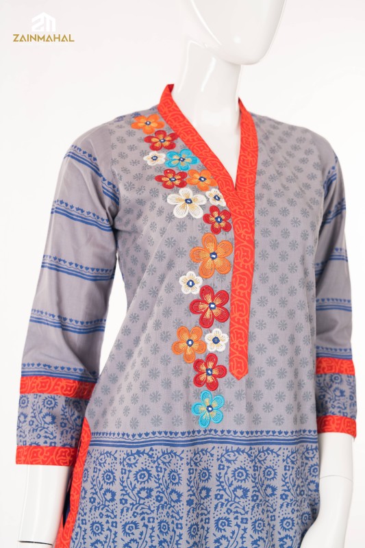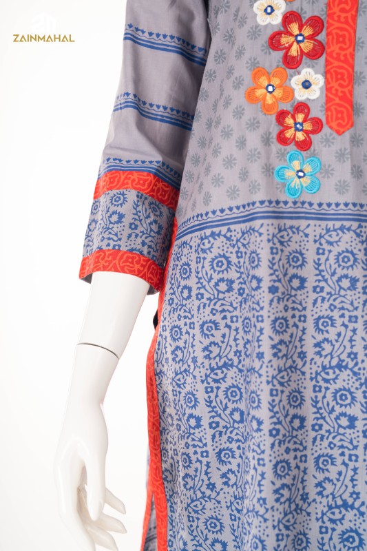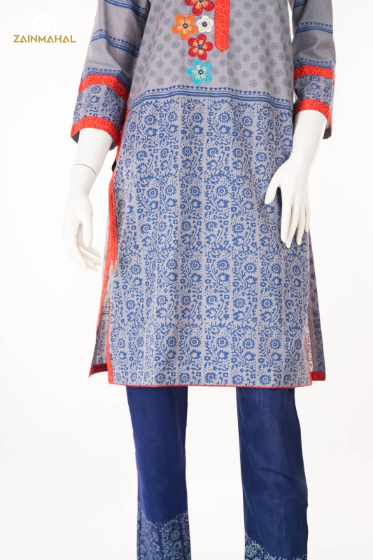 Elevate your elegance with our stunning ready-to-wear 2-piece grey cotton salwar kameez suit with black and off-white prints, enhanced with embroidery, decorative lace, and button detailing. Paired with a black printed cotton shalwar that exudes elegance and sophistication—ideal for effortlessly refined daywear.
