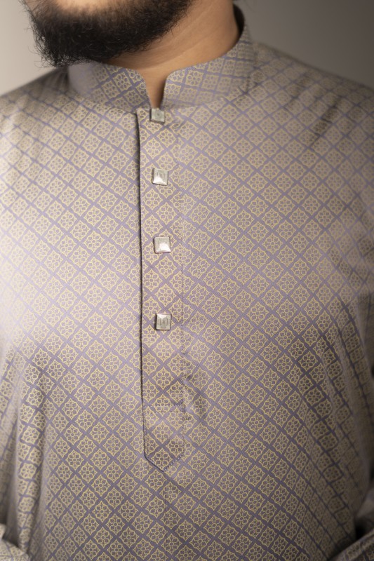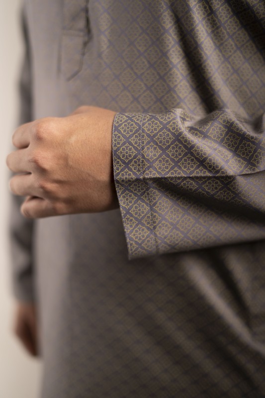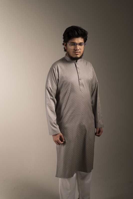 Experience the refined touch of our exclusive Kaizer fabric. This Panjabi features an intricate, all-over geometric pattern that adds a layer of sophistication to a soothing, neutral tone. Lightweight yet structured, it offers superior comfort for long hours while ensuring you look polished and distinct.