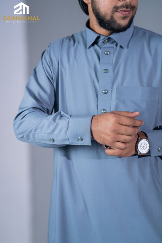 A thobe that embodies timeless Saudi craftsmanship with contemporary tailoring. Its unique design—featuring a classic pointed collar and meticulously finished button cuffs—creates a sophisticated silhouette that exudes both culture and authority.